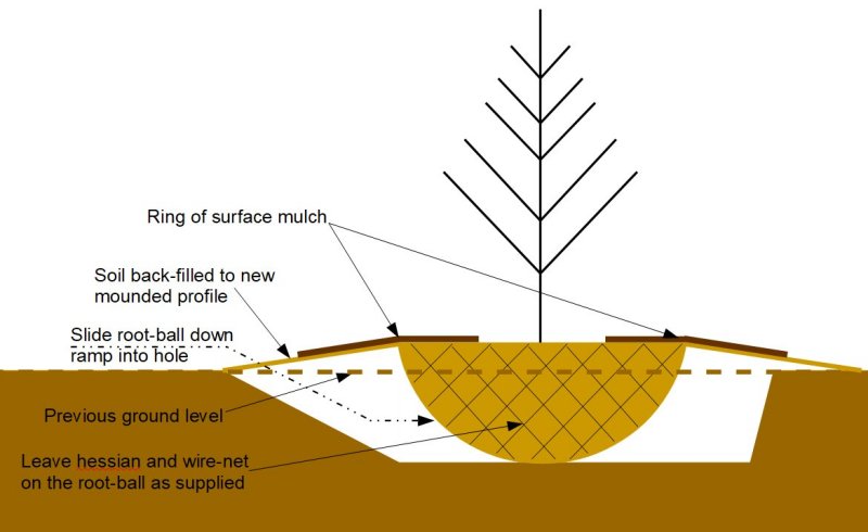 hole, but be careful not to bank the mulch up against the trunk. Hence the finished planting has something of the profile of an up-turned saucer. We have had brilliant results planting in this manner, and it's a lot less hard work!