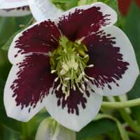 'White Magic' (H. niger x H. orientalis) This hybrid resembles H. niger in leaf shape, but has the better constitution of H. orientalis. The huge white flowers are pure white with prominent yellow stamens, and deepen to dark pink as they mature. In order to be true to name, this hybrid has to be divided which accounts for the higher price, but it is a truly magnificent form and very floriferous. |