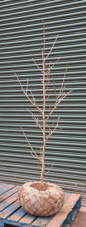 offer in a range of sizes. We're fundamentally different to most places - the principle here is that everything we sell, we propagate and grow ourselves - we don't buy in. We are growing an increasing number of our plants in the open ground. This system has a number of advantages. The plants grow more naturally, forming a lovely rootball in the soil, with no fear of root-spiralling or being pot-bound. The plant itself will be more compact and the wood firmer and riper, already acclimatised to the weather and needing minimal staking. Thus the whole plant is more robust than the equivalent one pushed on in a container under protection. This is becoming increasingly important as we experience periods of extreme weather conditions. They are lifted to order, root-balled and wrapped (not to be confused with "bare root" which is much less satisfactory) and we are having brilliant results in this manner. Our availability follows nature's cycle, typically being from December through to March.